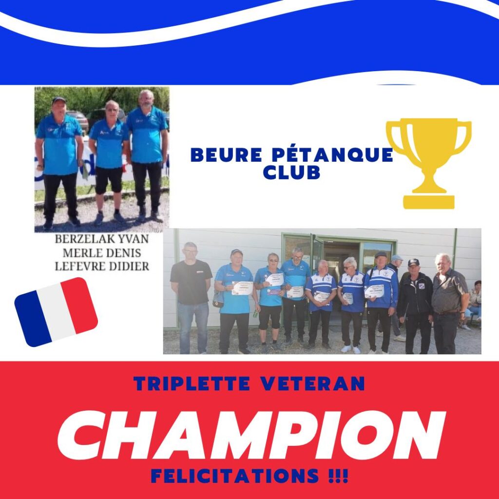 Victoire de la triplette vétérans composée de MERLE Denis, BERZELAK Yvan et FEFEVRE Didier. Ils sont qualifiés pour le championnat national à St Yrieix les 19 et 20 août 2026.