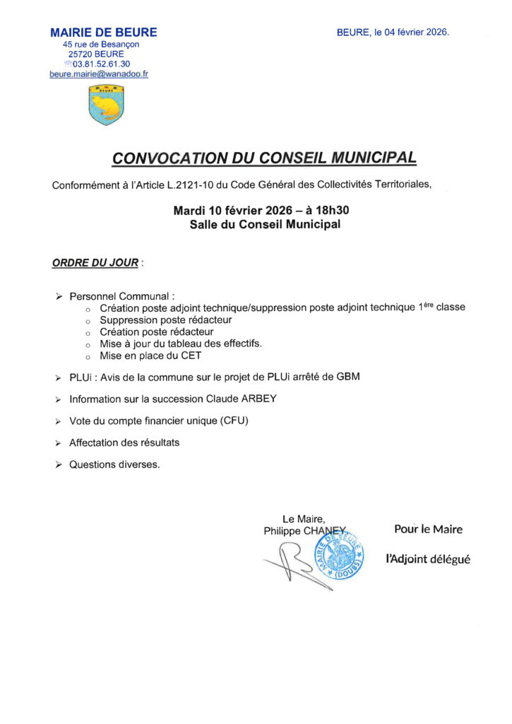 Le Conseil Municipal se réunira en Mairie, mardi 10 février 2026, à 18h30.